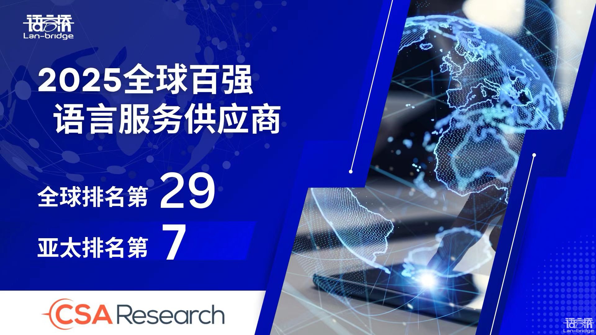 根據四川日報報道,語言橋已成功入選國家語言服務出口基地。根據CSA國際權威排行,語言橋已連續多年入選 CSA Global Top 50 語言服務供應商。CSA Research 2025全球百強語言服務供應商榜單語言橋集團全球排名再次提升了8個位次,躍升至第29名;亞太地區排名提升2個位次,位居第7名。2025年,在國際權威第三方機構——Slator發布的"The Slator 2025 Language Service Provider Index"(2025年語言服務提供商指數)中語言橋位列全球翻譯服務提供商第31位。與此同時,語言橋已榮獲ISO9001:2015質量管理體系認證、翻譯協會會員、AAAAA級筆譯服務認證、AAAAA級口譯服務認證等多項殊榮。